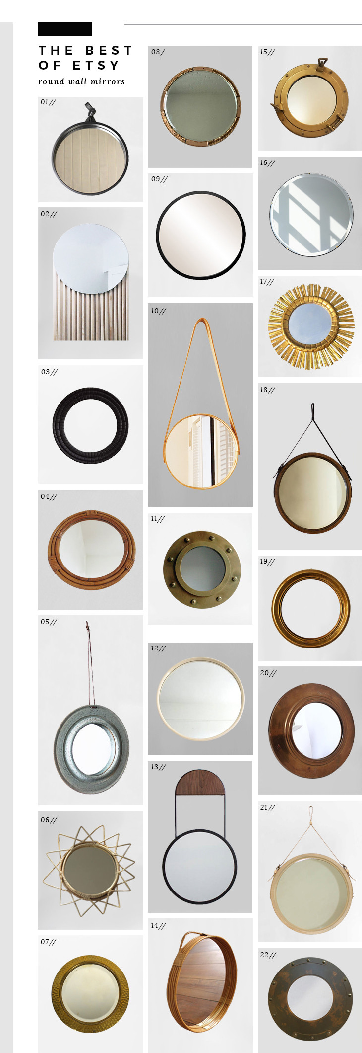 The round mirror is surrounded by a thin gold band, which is then encased in an iron frame. Our brand also has other round mirrors. In this episode of dwell made, mike montgomery of modern builds creates a round, wooden mirror from a single 10 foot 2x10 and a leather strap.